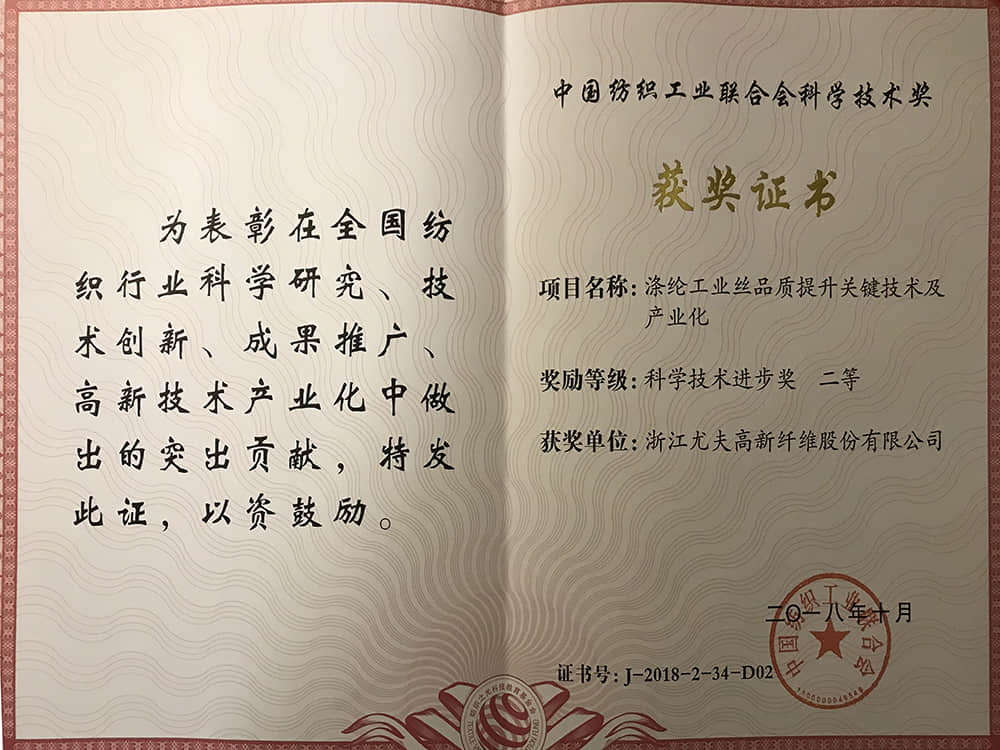 中國紡織工業(yè)聯(lián)合會科學技術獎二等獎2018.10